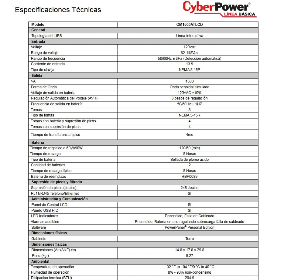 NO BREAK CYBERPOWER OM1500ATLCDA 1500VA / 900W, INTERACTIVO, TORRE, 8 NEMA 5-15R, 4 RESPALDO Y 4 SUPRESIN, 2 AÑOS DE GARANTA EN EQUIPO
